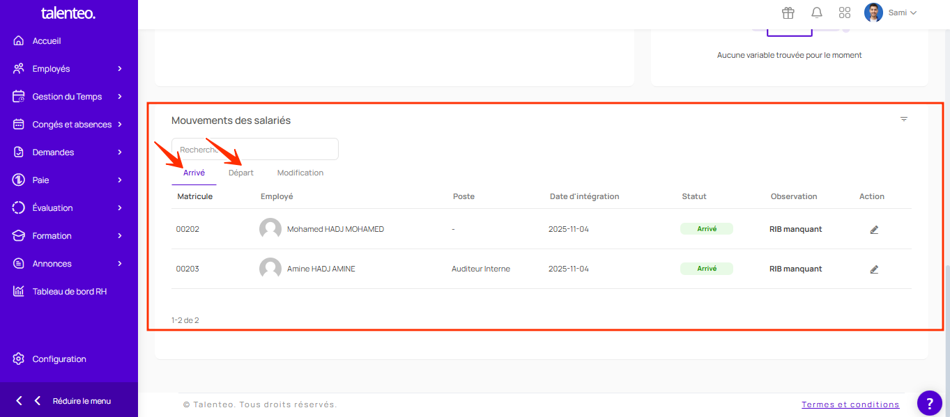 En bas : consultez les entrants et sortants avec les dates d'intégration