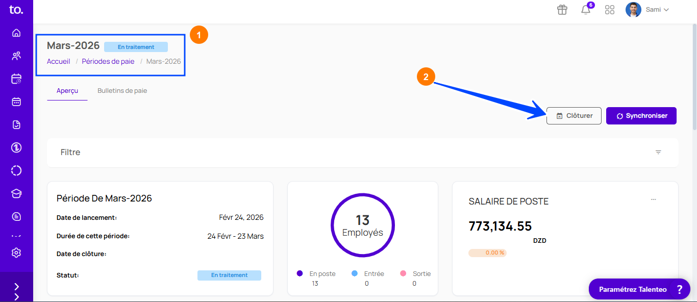 Cliquez sur le bouton Clôture depuis le menu Aperçu paie, ou depuis le menu Période de paie :